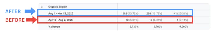 But from August 1 to November 15, 2025, that number exploded to 282 clicks (13.72%)—a 2,700% increase.