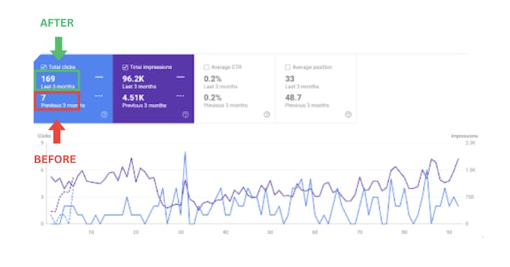 We saw a 5,600% increase in organic clicks, skyrocketing from 7 clicks/month to 169 clicks/month.