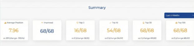 In fact, 68 out of 68 keywords improved, 16 landing in the top 3 and 54 in the top 10.