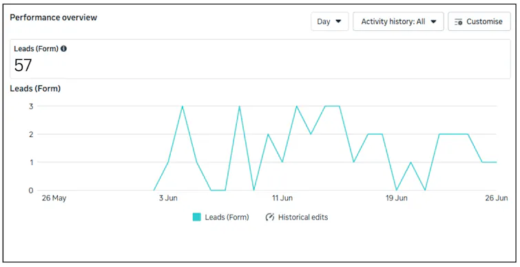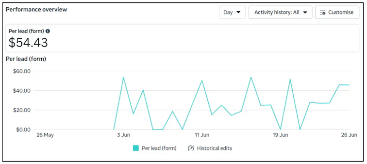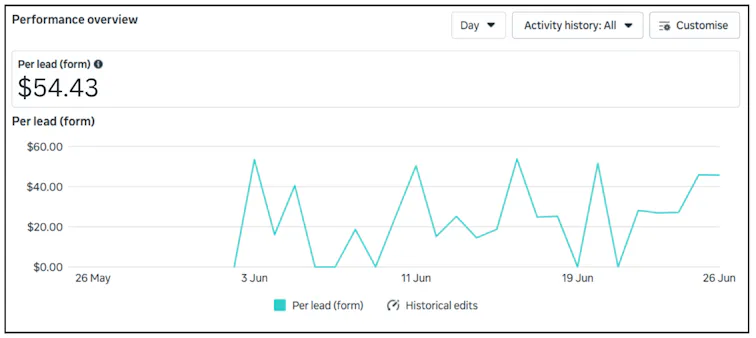 The cost per lead (CPL) was just $54.43, as shown in the performance overview from the Meta dashboard.